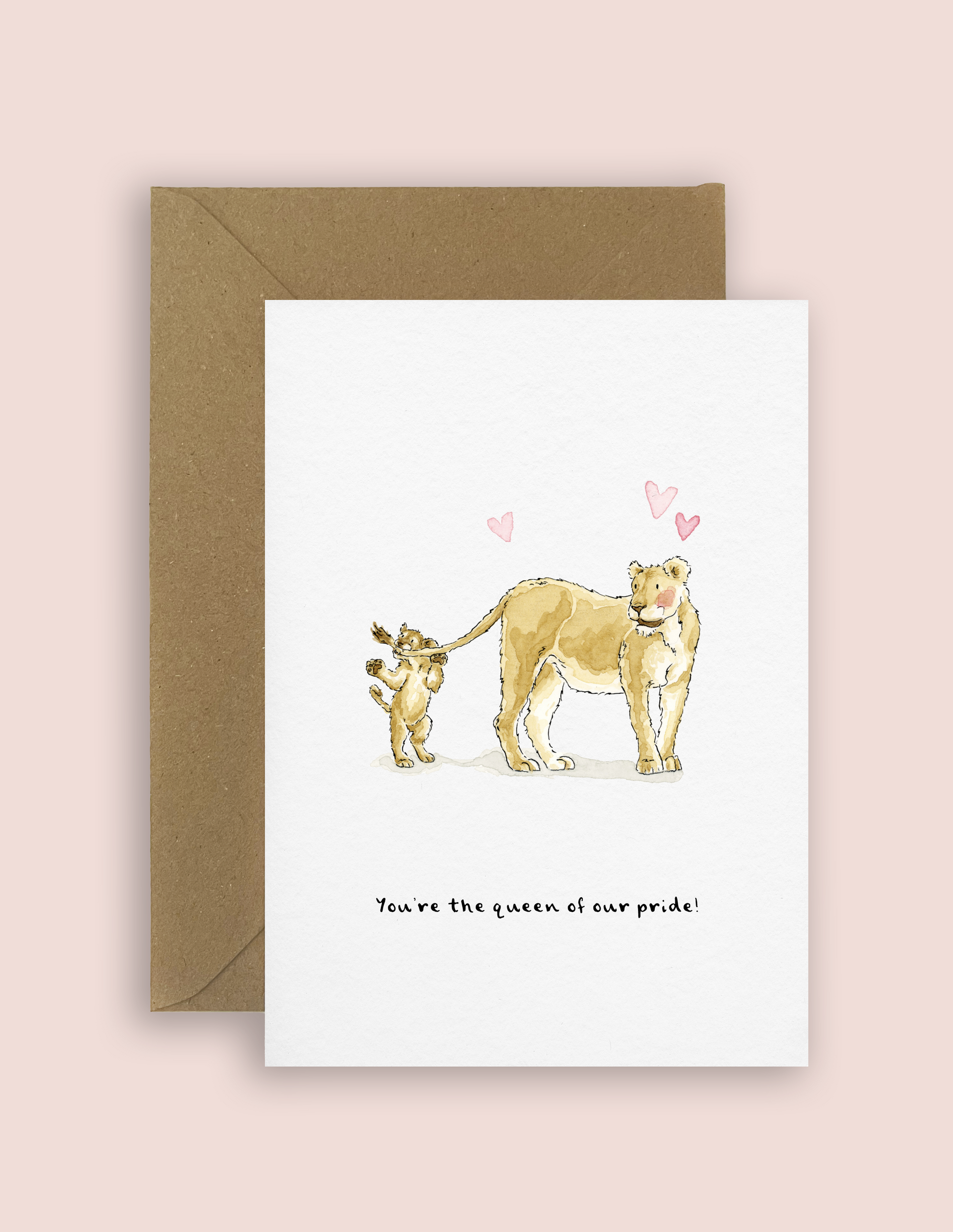 Celebrate the queen of your pride this Mother’s Day with this beautifully hand-illustrated card featuring a majestic lioness and her cub. With the heartfelt message, "You're the Queen of Our Pride," it’s the perfect way to show appreciation for a mum’s love and strength.
